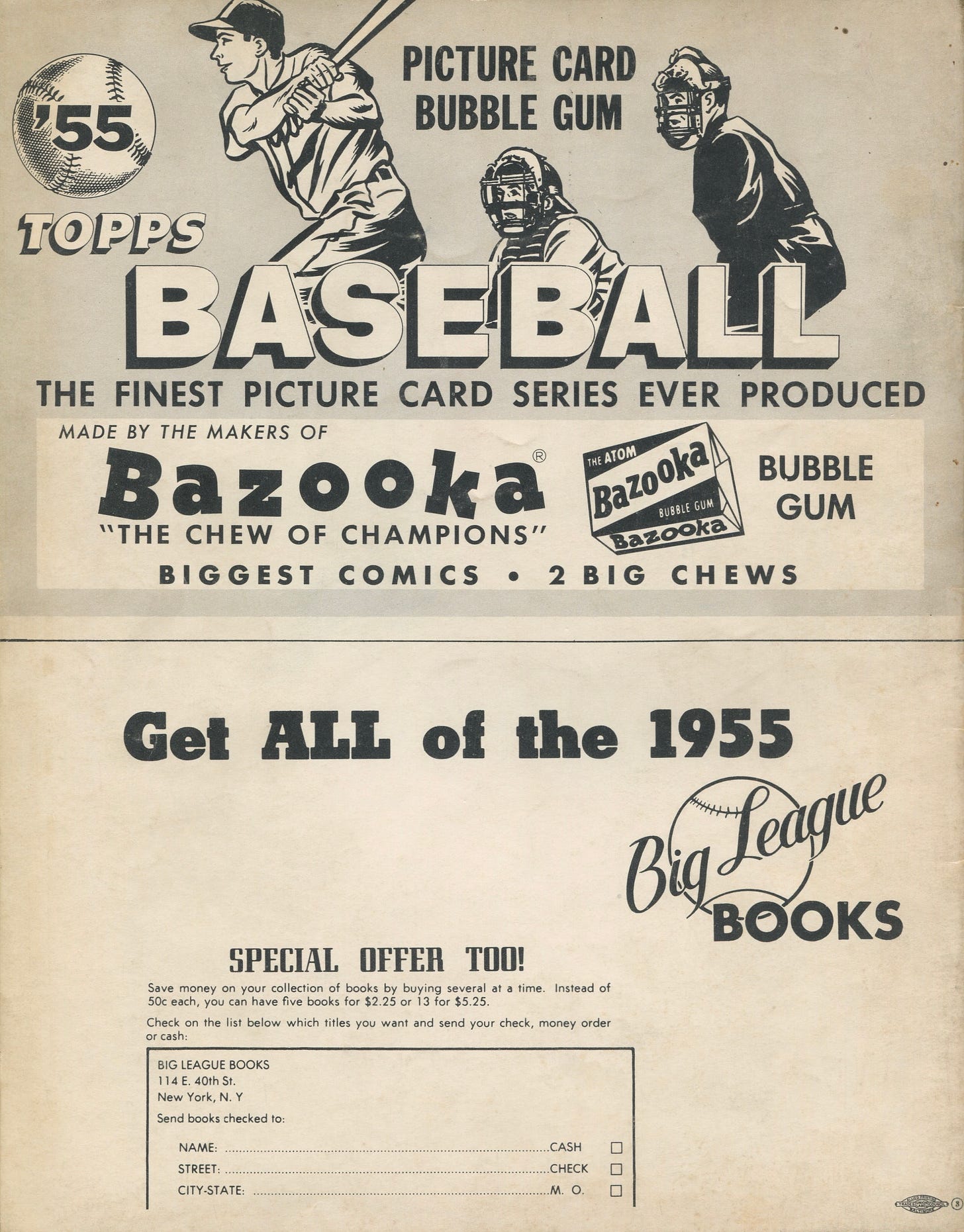 The real reason is on the back cover, where Topps placed a bold advertisement across the top half proclaiming’55 Topps Baseball cards were The Finest Picture Card Series Ever Produced!