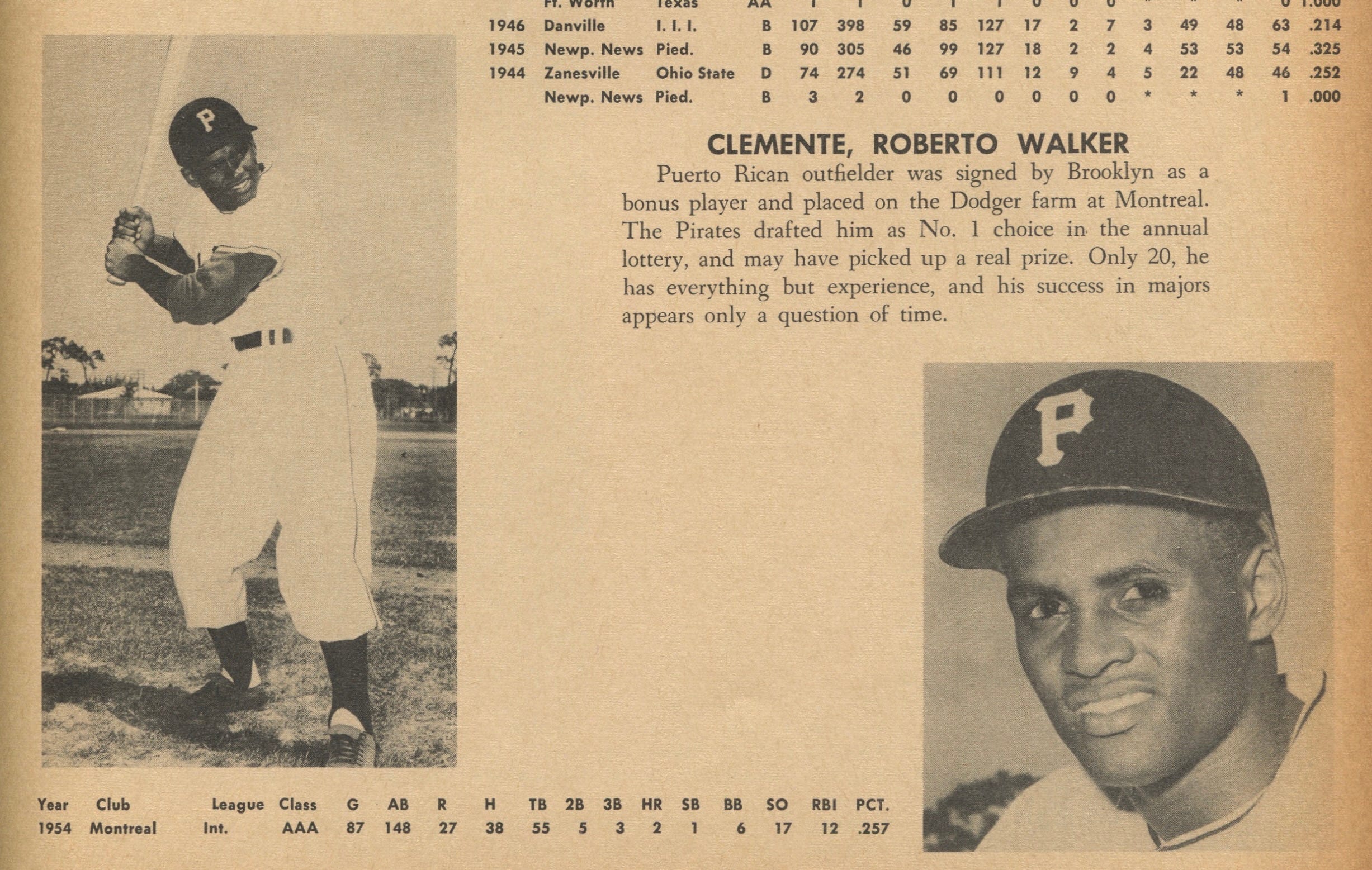 At first glance, you might assume the appeal is obvious. The yearbook includes a brief bio of Roberto Walker Clemente, along with a pair of team photographs that were probably the same ones used as the source for his 1955 Topps rookie card.
